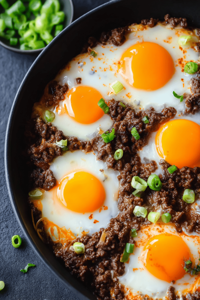 Create small wells in the beef and salsa mixture. Crack the eggs into the wells, then cover the skillet with a lid. Let the eggs cook for about 6-7 minutes until the whites are set and the yolks are cooked to your liking.
