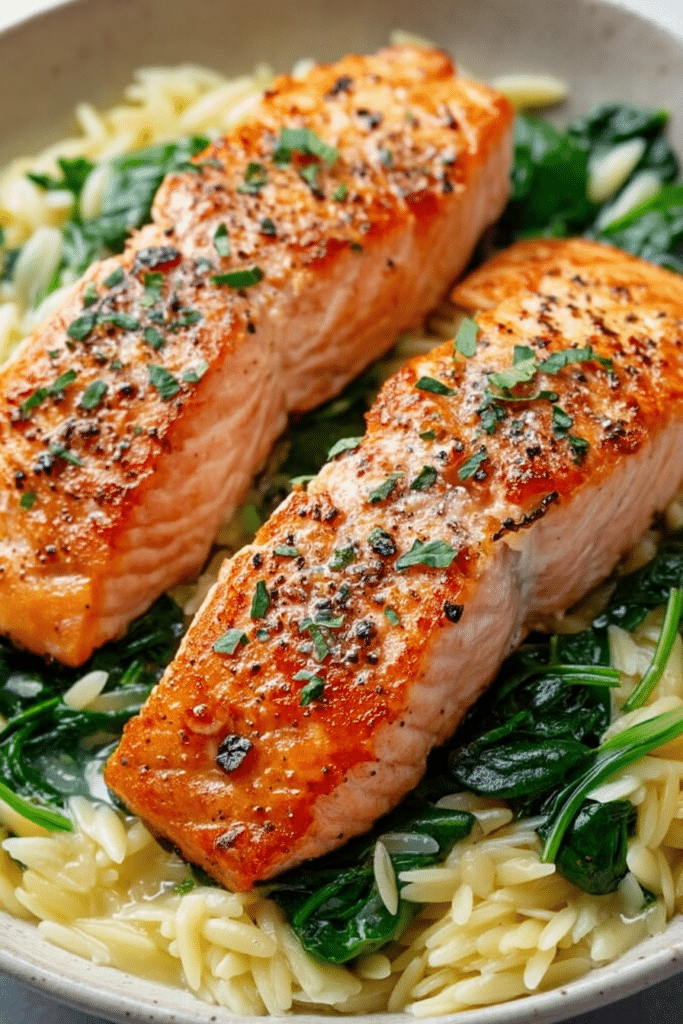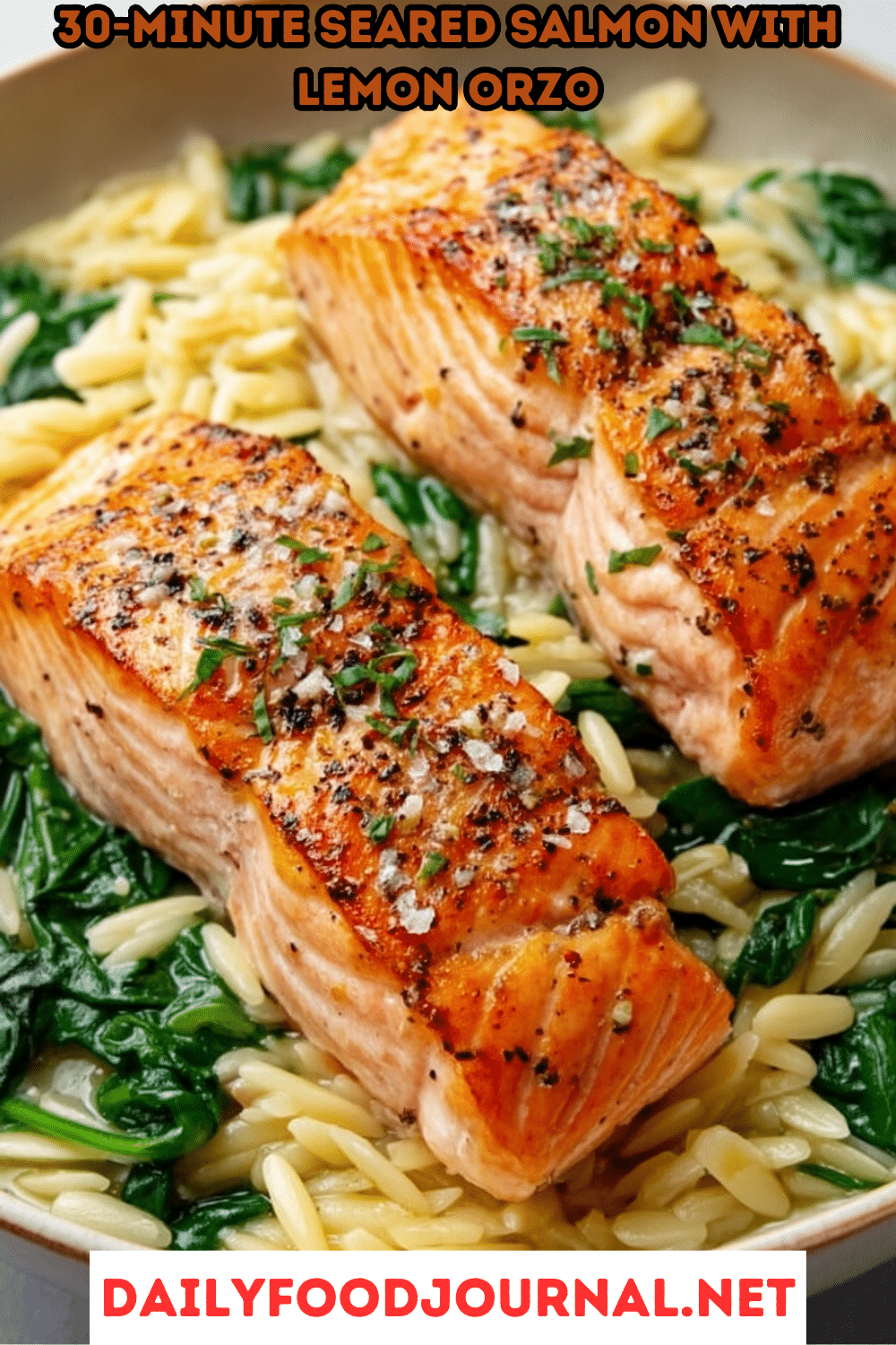Make this delicious 30-Minute Seared Salmon with Lemon Orzo for a comforting, easy one-skillet dinner. Tender salmon, creamy orzo, fresh spinach, and a hint of lemon make this dish a favorite for busy weeknights or elegant meals at home. Ready in just half an hour!
