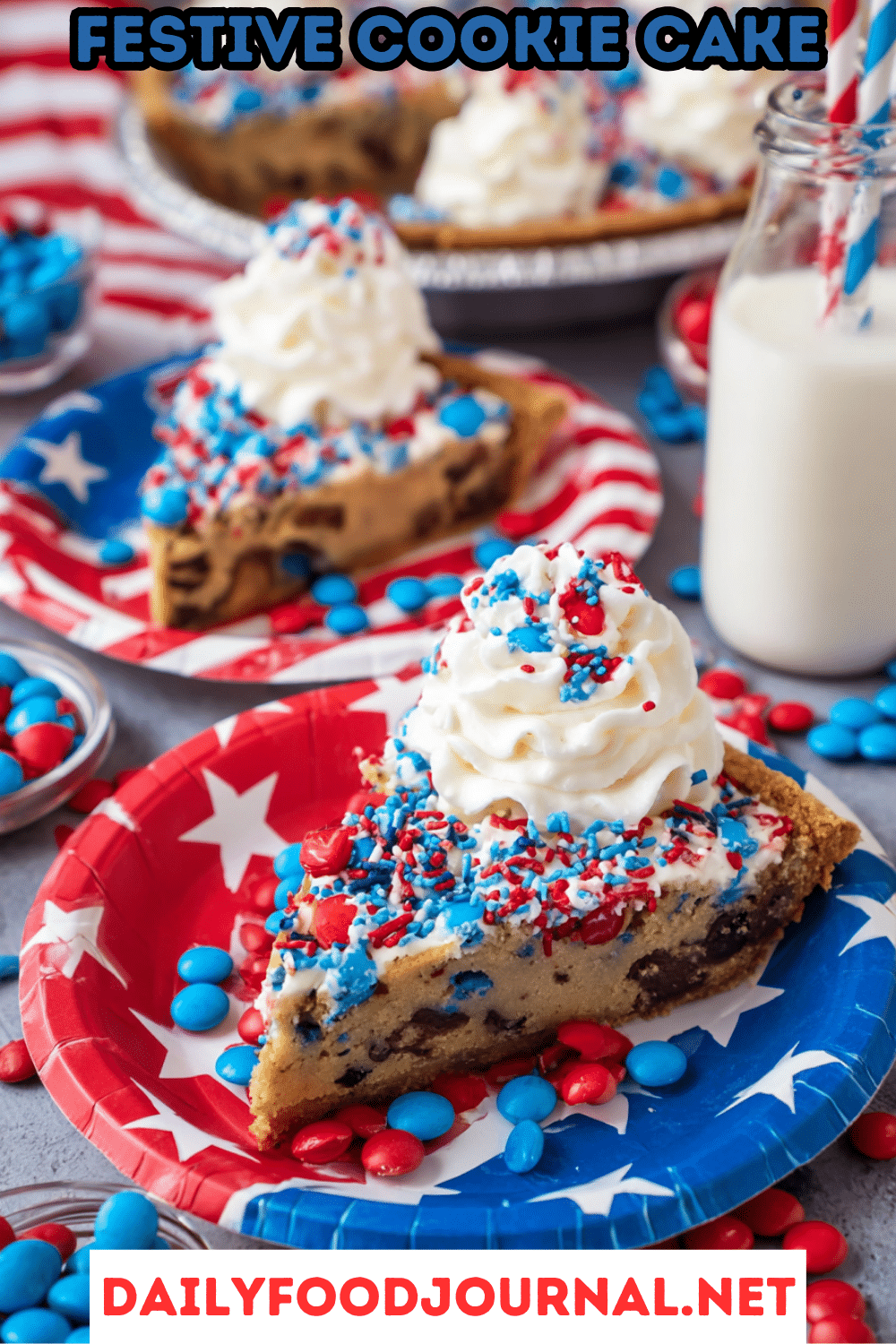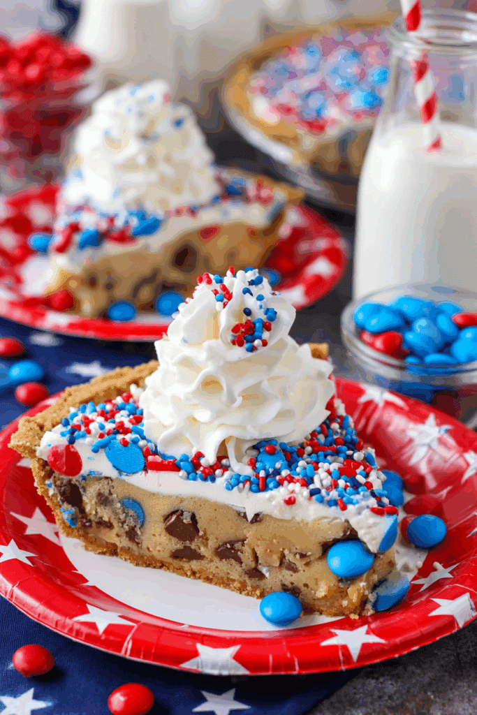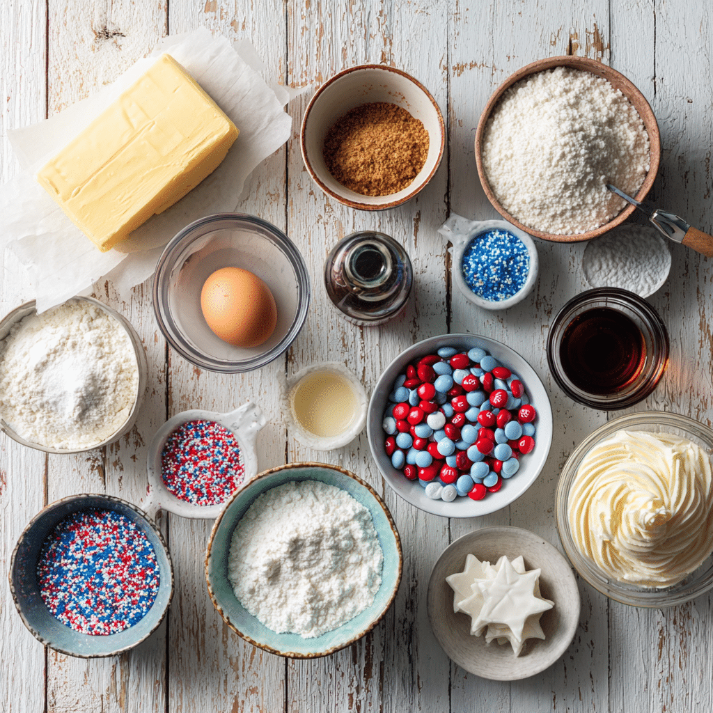 • Why it matters: Butter and sugars create a chewy texture, cornstarch keeps it soft, and baking soda ensures a slight rise. Chocolate chips, M&M’s, and sprinkles add flavor and patriotic flair.