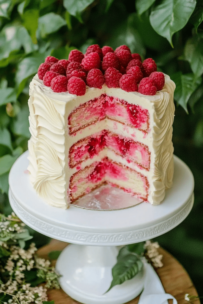 The sweetness of the cake is perfectly balanced with the slightly tart raspberry swirl, adding bursts of flavor to every forkful.