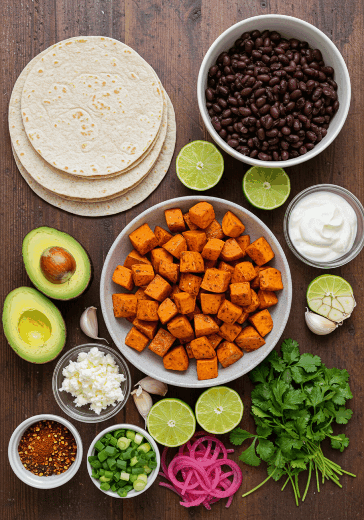 To make Avocado Sweet Potato Tacos for 2–3 servings, you’ll need these key ingredients. Each one adds a layer of flavor or texture to this delightful dish: