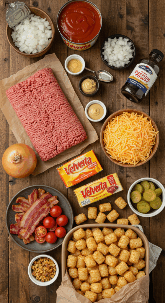 To make Bacon Cheeseburger Tater Tot Bake for 12 servings, you’ll need these key ingredients. Each one adds a layer of flavor or texture to this comforting dish: