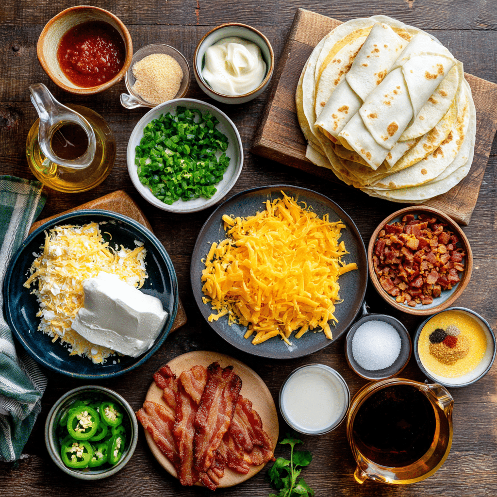 Why They’re Important: Cream cheese and cheddar form the rich, cheesy base, while bacon and jalapeños add smoky and spicy notes. Eggroll wrappers baked into chips provide the signature crunch, and optional seasonings like garlic and onion powder enhance depth. Dipping sauces and garnishes elevate the dish with customizable flavors and a polished finish.