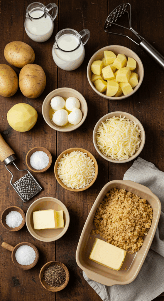 - Gather all ingredients: 1 tablespoon butter, 4 pounds russet potatoes, 1 cup whole milk, ½ cup melted butter, 1 ½ cups grated mozzarella, 1 cup grated Parmesan, salt, pepper, 2 tablespoons bread crumbs.