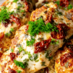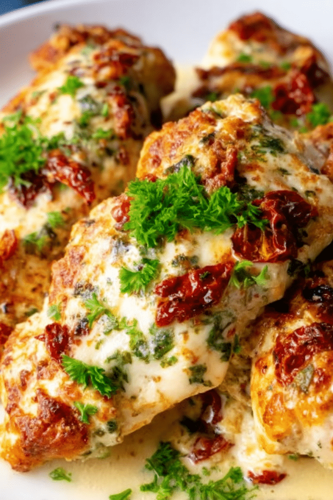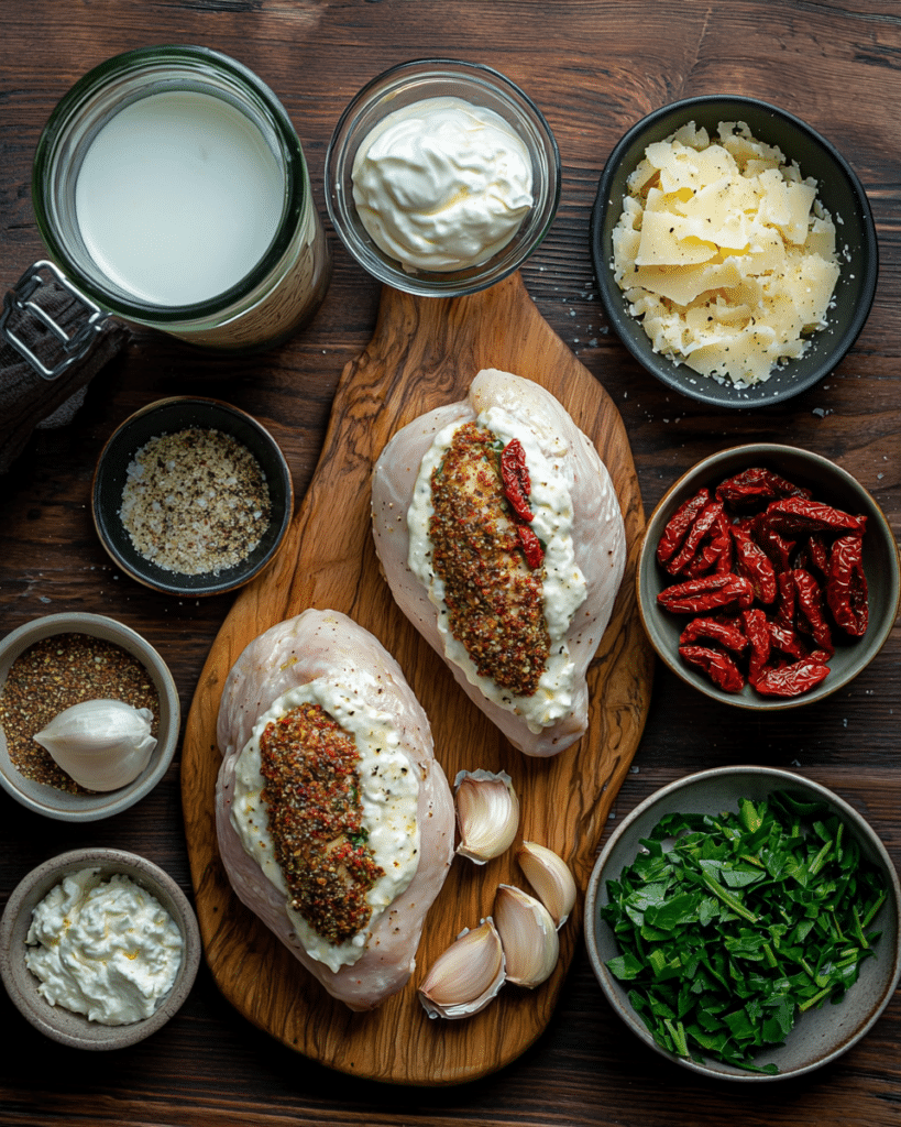 Boneless, skinless chicken breasts are perfect for this dish because they cook quickly and absorb all the creamy, cheesy flavors. Fresh minced garlic infuses the dish with a rich, aromatic base that’s unmistakably Italian. Cream cheese and heavy cream combine to make the sauce incredibly creamy without feeling too rich. Fresh spinach adds a pop of color and earthiness that balances the richness. Italian seasoning, smoked paprika, onion powder, and chili powder create layers of deep, herby warmth. Parmesan cheese adds salty, nutty complexity, while mozzarella melts into a gooey, irresistible topping. Sun-dried tomatoes bring sweet, tangy bursts of flavor that perfectly complement the creamy base.