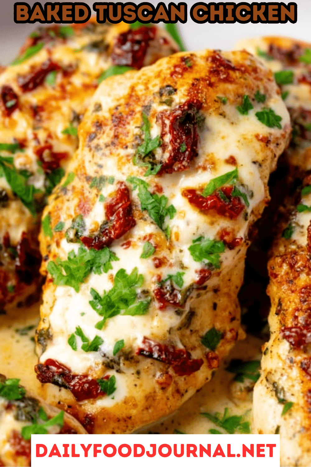 Learn how to make Baked Tuscan Chicken with creamy spinach, sun-dried tomatoes, and a cheesy topping. An irresistible, easy-to-make dinner perfect for busy nights or special occasions!