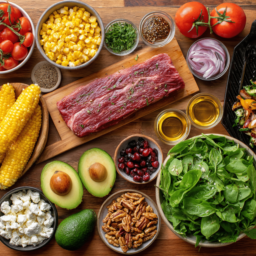 - Make-Ahead: Marinate steak and make dressing up to 24 hours in advance; grill corn and toast nuts up to 1 day ahead. Prep veggies and greens but store separately until serving.