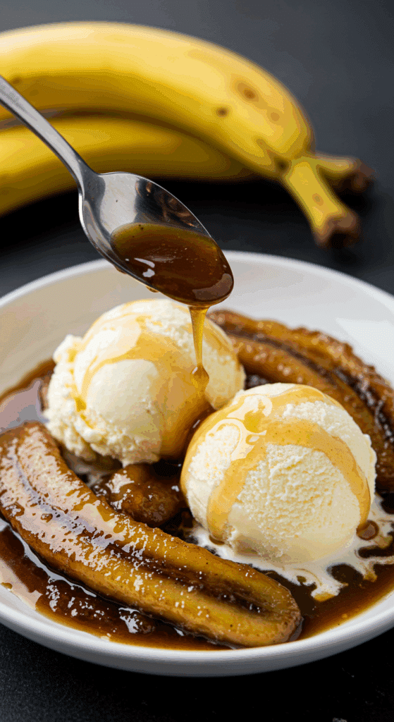 - Bananas and Sauce: Spoon the warm bananas and sauce generously over the ice cream, letting the sauce pool around it.