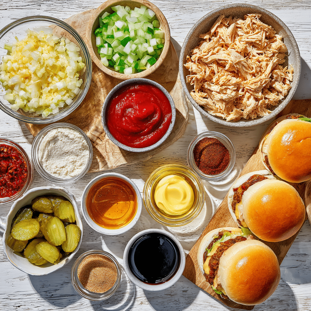 - Slow-Cooker Option: Sauté veggies, then combine all ingredients (except buns and pickles) in a 3-quart slow cooker. Cook on Low for 3-4 hours, shred chicken if whole, and serve.