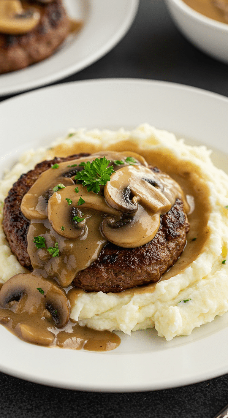 - Serving: Place a generous scoop of hot mashed potatoes on each plate, then top with a Salisbury steak patty and a ladle of mushroom gravy. Ensure each serving gets plenty of mushrooms and sauce.