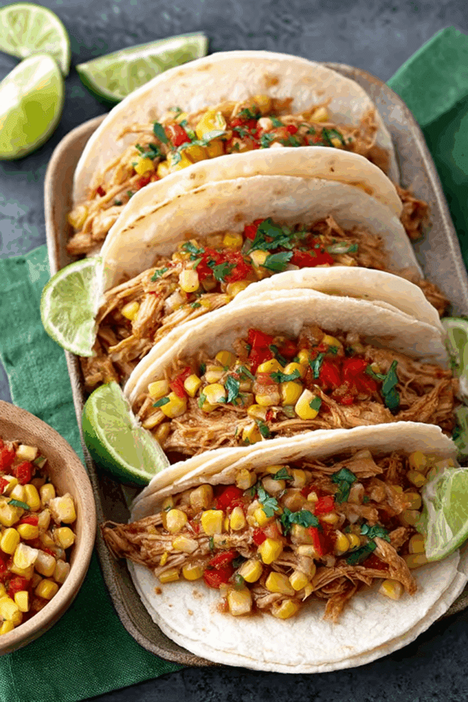 - Why It’s Unique: The homemade bourbon barbecue sauce, made with ketchup, maple syrup, and Worcestershire, gives the chicken a sweet, tangy, and smoky flavor. The fresh corn salsa with lime and red pepper adds crunch and brightness, making these tacos a perfect balance of rich and refreshing.