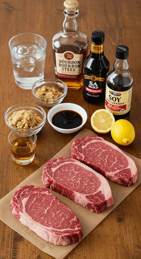 • Gather all ingredients: 1 cup water, ⅔ cup bourbon, ½ cup soy sauce, ¼ cup brown sugar, 3 tablespoons Worcestershire sauce, 2 tablespoons lemon juice, 4 rib-eye steaks.
