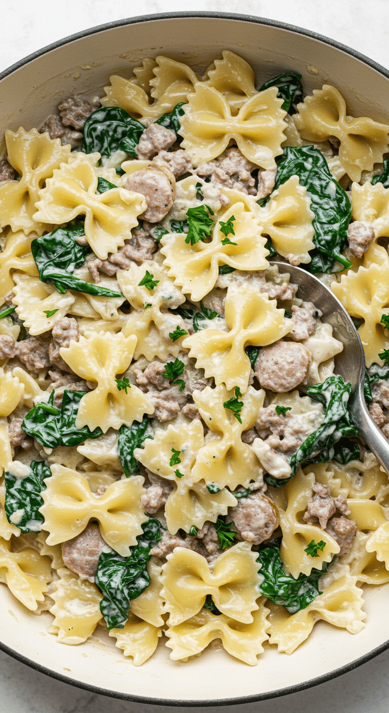 • Serving: Spoon generous portions into bowls or onto plates, ensuring each serving gets a mix of pasta, sausage, spinach, and creamy sauce. Serve family-style from a large bowl for a cozy vibe.