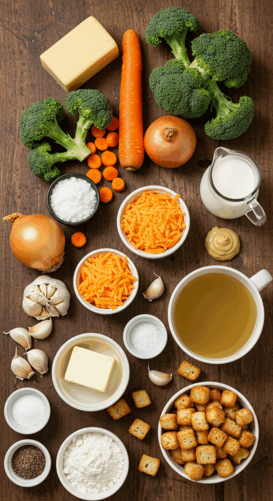 Why These Ingredients Matter: The broccoli and carrots provide fiber and nutrients, while the cheddar and milk create a creamy, indulgent texture. The mustard and garlic add depth, and optional croutons bring crunch, making this a balanced, comforting meal perfect for vegetarian diets.