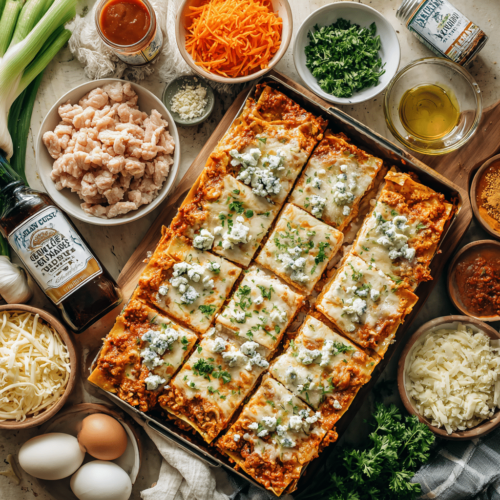Buffalo Chicken Lasagna uses bold ingredients to create its signature spicy, cheesy profile. Here’s what you need and why each one matters:
