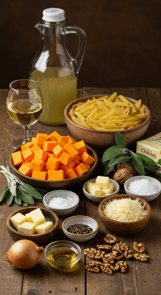• Gather all ingredients: 2 pounds butternut squash, kosher salt, black pepper, 4 tablespoons olive oil, 6 tablespoons butter, 10 whole sage leaves, 1 tablespoon chopped sage, ½ small onion, 1 pound penne pasta, 1 ½ cups white wine, 3 ½ cups chicken broth, ¾ cup Parmesan, ¼ cup walnuts (optional).