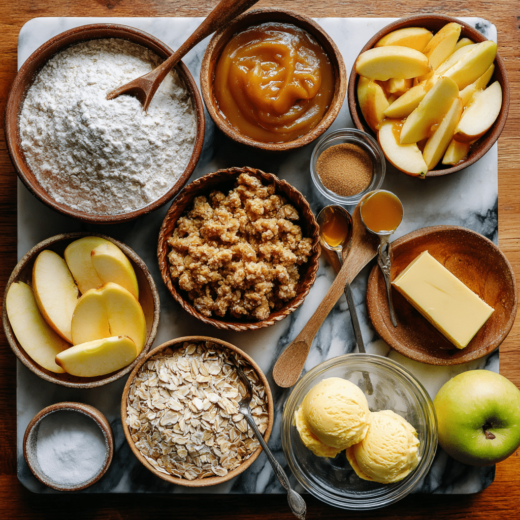 Why They’re Important: The apples and apple pie spice deliver the signature fall flavor, while the brown sugar adds caramelized sweetness. The oat-flour-butter crumble provides a buttery, crunchy contrast, and the optional ice cream and caramel elevate the dessert to indulgent bliss, making each spoonful a cozy delight