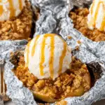 A: Yes! Follow the original instructions: toss apples with sugars and spice, top with a flour-oat-butter crumble, seal in foil packets, and cook on a grill or campfire grate at 350°F for 20 minutes. Serve with ice cream and caramel.