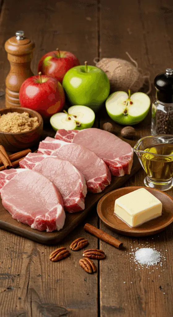 Caramel Apple Pork Chops use simple ingredients for a flavorful, seasonal result. Here’s what you’ll need for 4 servings: