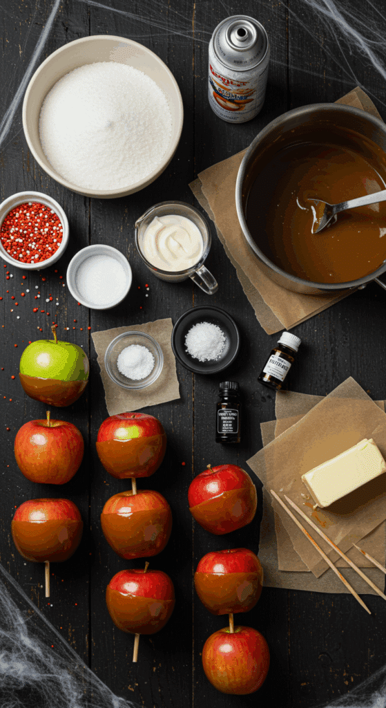 Apples provide fiber and vitamins like C, making these treats slightly nutritious. The caramel’s rich sweetness contrasts with the tart apple, creating a perfect balance. The corn syrup ensures a glossy, grippy coating, ideal for Halloween presentation. The ingredients are affordable, widely available, and adaptable for vegan or gluten-free diets, making this recipe versatile for fall fun.