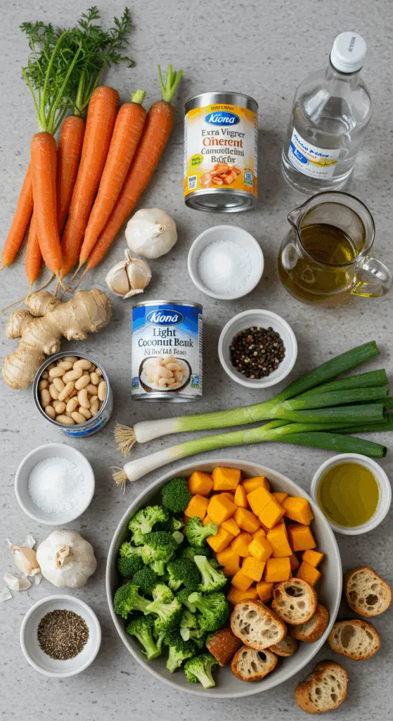 - Gather all ingredients: 3 tablespoons olive oil, 2 scallions, 2 tablespoons ginger, 2 cloves garlic, 5 carrots, salt, pepper, 14-ounce can coconut milk, 15-ounce can cannellini beans, 3 cups water, ½ acorn squash, 3 cups broccoli, 2 slices bread, 2 tablespoons olive oil for roasting.