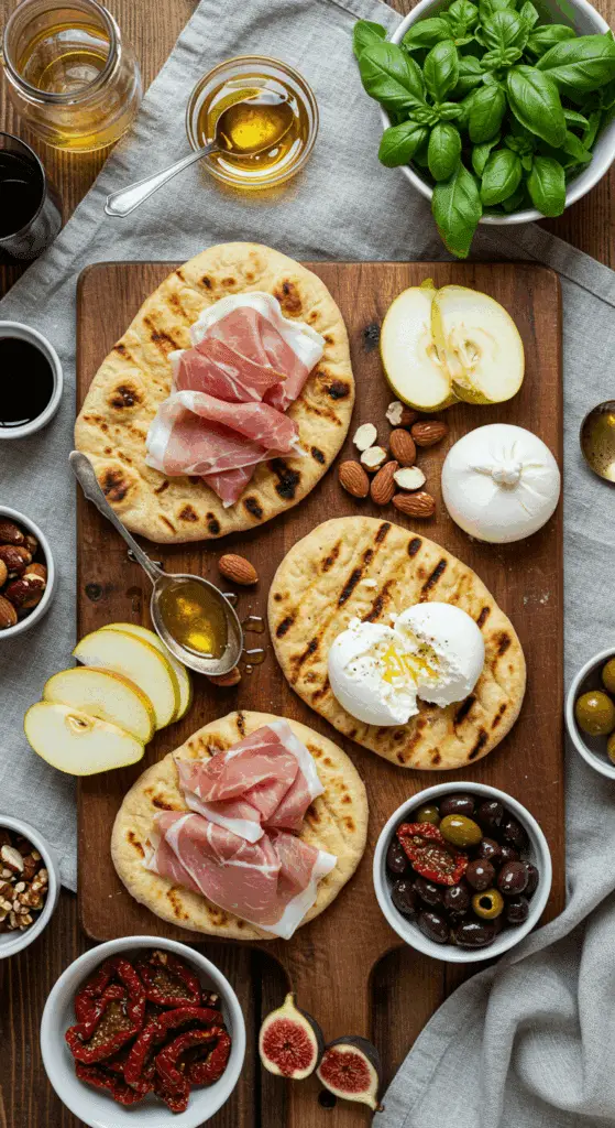 Serve on a board with wine or sparkling water, garnished with basil, almonds, or a balsamic drizzle for elegance.