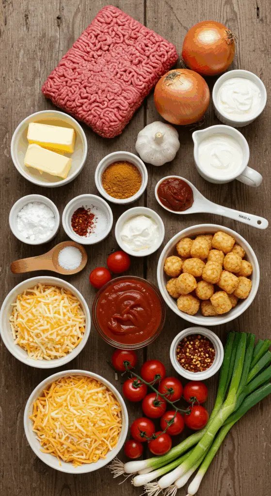 Here’s what you need to make Cheeseburger Tater Tot Casserole. Each ingredient adds to the cheesy, savory, and crispy magic.