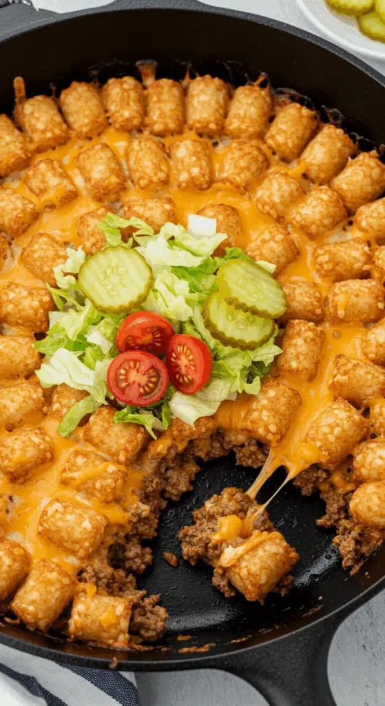 Craving a hearty, crowd-pleasing dish that combines the flavors of a cheeseburger with crispy tater tots? This Cheeseburger Tater Tot Casserole is your perfect choice! Featuring seasoned ground beef, a creamy tomato-based sauce, melted Mexican blend cheese, and golden tater tots, all topped with sour cream, cherry tomatoes, and green onions, this skillet casserole is comfort food at its finest