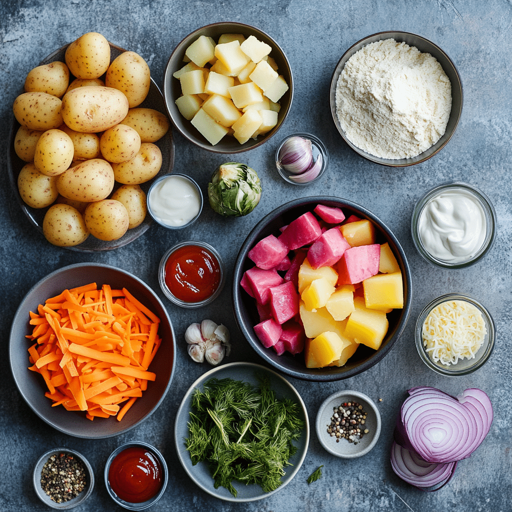 Let’s take a closer look at the ingredients. First, we have Yukon Gold potatoes, peeled and cubed, and garlic cloves, halved. These form the base of the mashed potato topping.