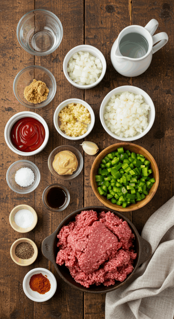 • Gather all ingredients: 1 ½ pounds extra lean ground beef, ½ onion, 2 cloves garlic, 1 green bell pepper, 2 cups water (divided), ¾ cup ketchup, 2 tablespoons brown sugar, 1 teaspoon Dijon mustard, 1 dash Worcestershire sauce, 1 ½ teaspoons salt, ½ teaspoon ground black pepper, and a pinch of cayenne pepper.