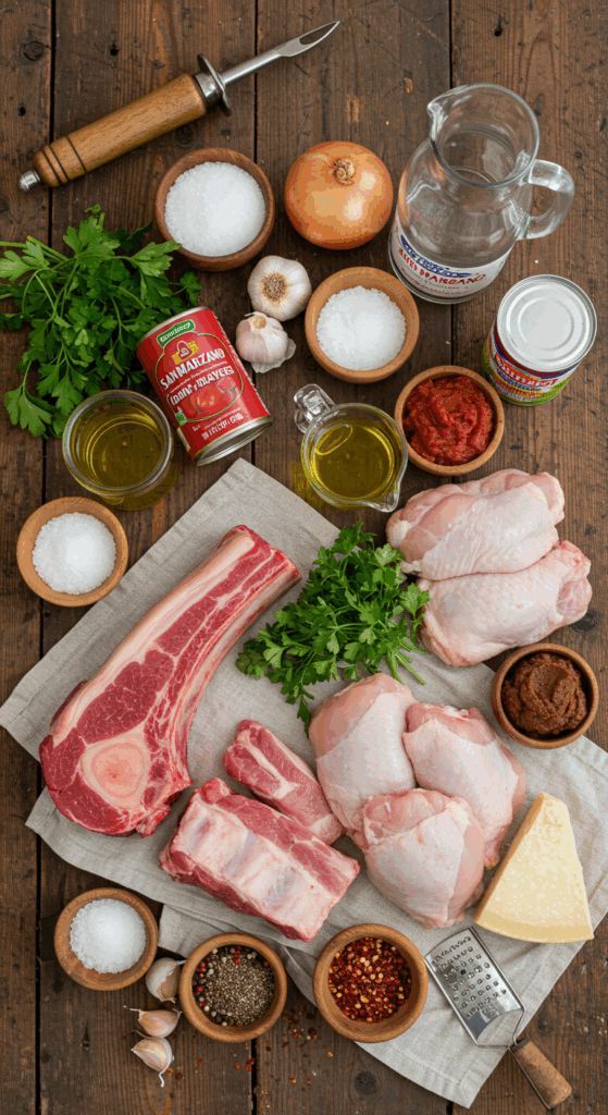 - Gather all ingredients: 2 tablespoons olive oil, 1 slice beef shank, 2 pounds pork spareribs, 2 bone-in chicken thighs, 1 onion (diced), 1 pinch salt, 6 cloves garlic, 3 (28 ounce) cans crushed San Marzano tomatoes, 2 cups water, ¼ cup tomato paste, ¼ cup grated Parmigiano-Reggiano, 2 tablespoons chopped Italian parsley, 2 teaspoons salt, 1 teaspoon black pepper, and ¼ teaspoon red pepper flakes.
