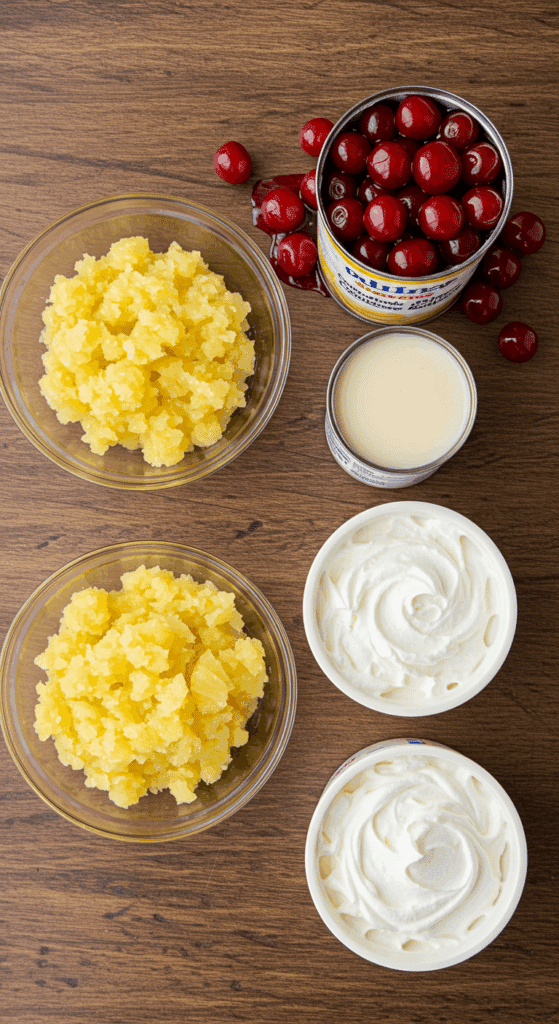 Why These Ingredients Matter: The cherry pie filling delivers bold fruit flavor, the pineapple adds a tangy contrast, the condensed milk provides sweetness and creaminess, and the whipped topping ensures a light, airy texture.