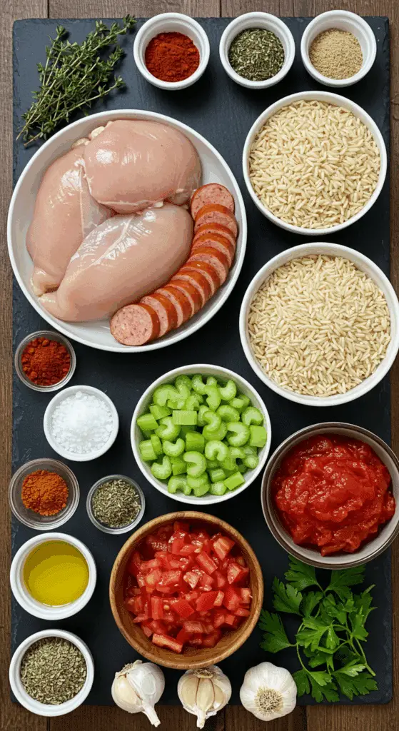 Here’s what you need to make Chicken and Chicken Sausage Jambalaya. Each ingredient adds to the hearty, spicy, and savory magic.