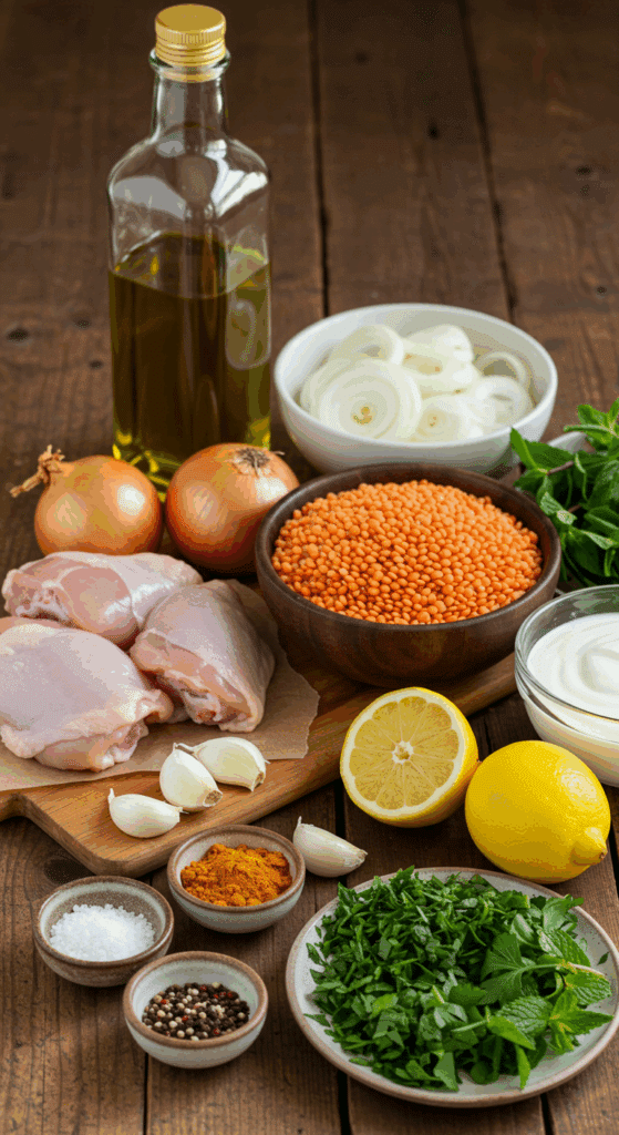 • Gather all ingredients: 3 tablespoons olive oil, 2 onions, 6 garlic cloves, 1 pound chicken thighs, 1½ cups red lentils, 1 teaspoon turmeric, salt, pepper, 1 cup mixed herbs, 1 cup yogurt, 2 tablespoons lemon juice.