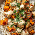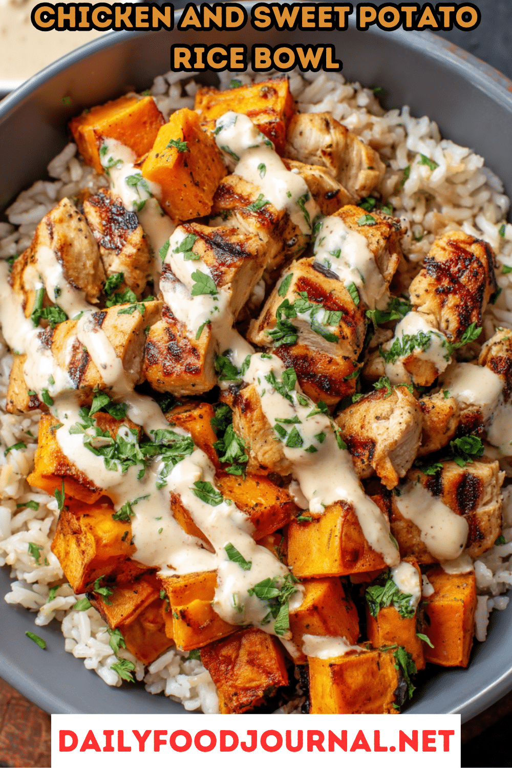 This Chicken and Sweet Potato Rice Bowl is a quick, healthy meal with tender chicken, roasted sweet potatoes, and creamy tahini sauce. Perfect for a balanced lunch or dinner, ready in under 30 minutes!