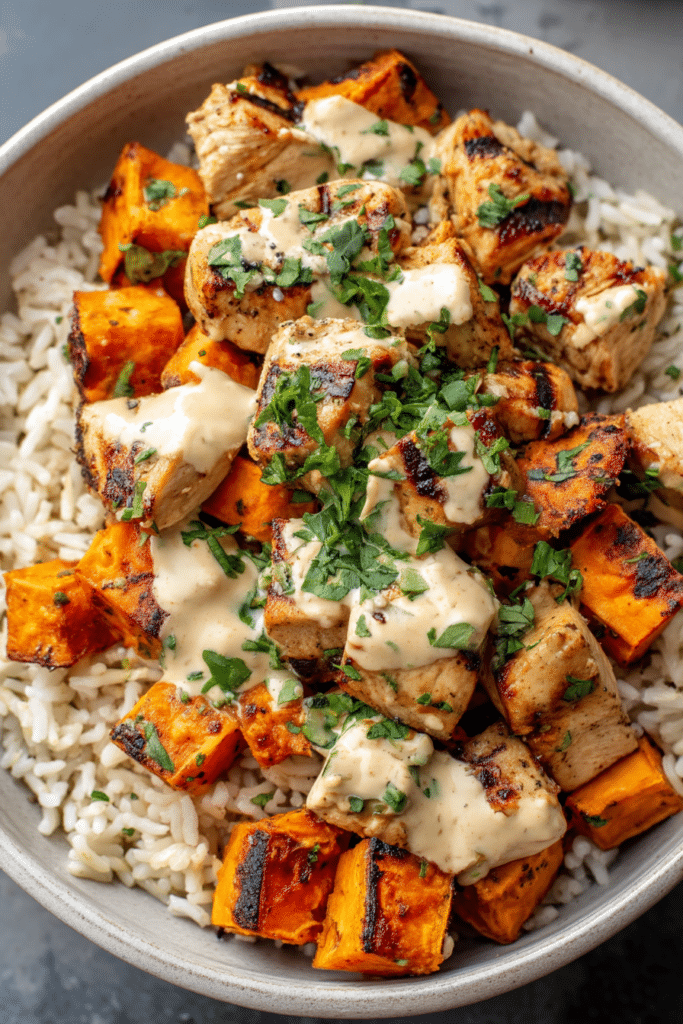 With tender chicken, roasted sweet potatoes, and a drizzle of creamy tahini sauce, it’s the perfect balance of protein, carbs, and healthy fats.