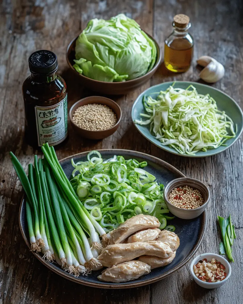 Chop the chicken into bite-sized pieces, shred the cabbage, and mince the ginger and garlic.