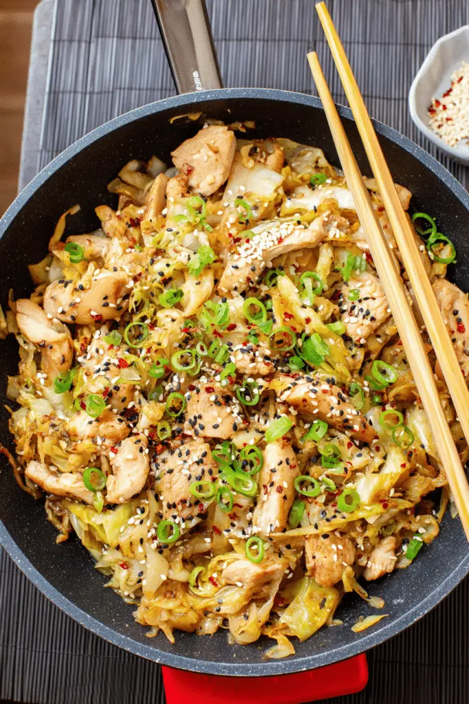 We stir-fried juicy chicken, fresh cabbage, and aromatic ginger and garlic into a savory, satisfying skillet meal.