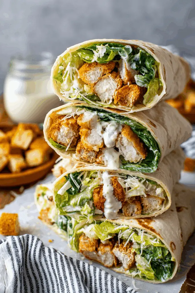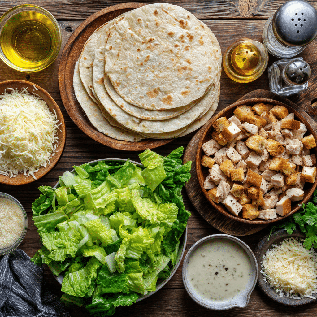Why They’re Important: The chicken provides a savory core, while the homemade Caesar dressing delivers creamy, authentic flavor. Romaine and croutons add classic crunch, Parmesan brings cheesy depth, and tortillas make it a convenient, handheld meal.
