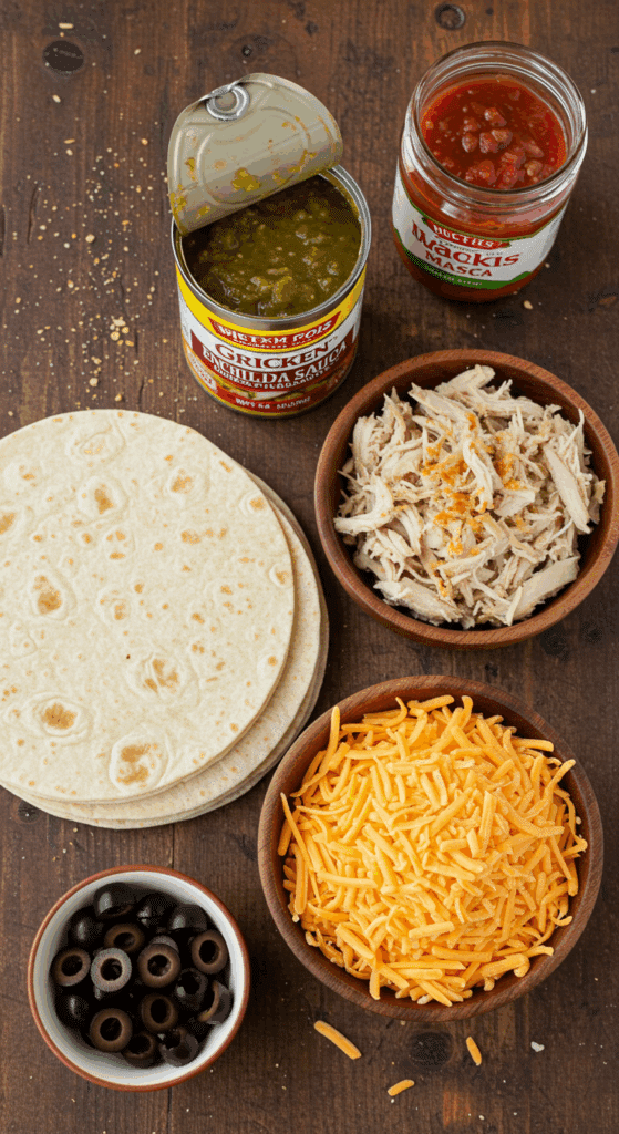 Why These Ingredients Matter: The chicken provides protein, while the enchilada sauce and cheese deliver bold, cheesy Tex-Mex flavor. The tortillas create a hearty structure, and the olives add a savory pop, making this a balanced, crowd-pleasing meal perfect for comfort food lovers.