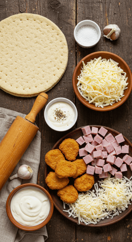 To make Chicken Cordon Bleu Pizza for 6 servings, you’ll need these key ingredients. Each one brings a piece of the classic Cordon Bleu to the pizza: