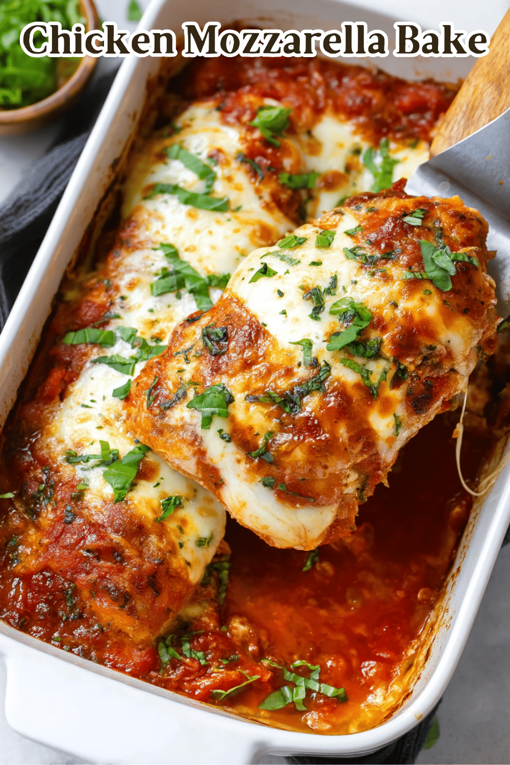 This Chicken Mozzarella Bake is the perfect cozy dinner. Tender, seasoned chicken breasts baked in a rich tomato sauce and topped with melty mozzarella and fresh basil for a simple yet flavorful family favorite!