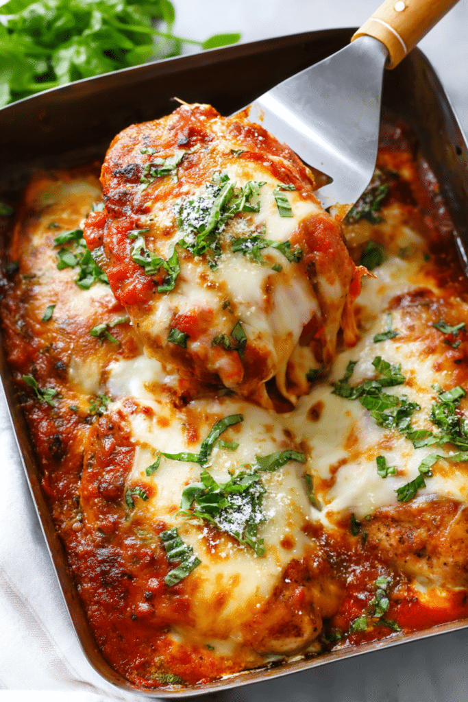 A sharp knife and cutting board are essential for prepping the chicken and slicing ingredients. A meat mallet is handy if you need to pound out the chicken to an even thickness. A deep baking dish fits the chicken snugly and helps the sauce bubble up beautifully around it.