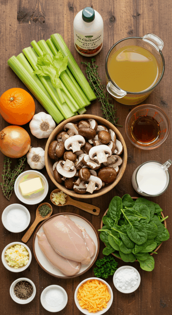 Here’s what you need to make this Chicken Mushroom Soup. Each ingredient adds to the creamy, savory, and umami-rich magic.