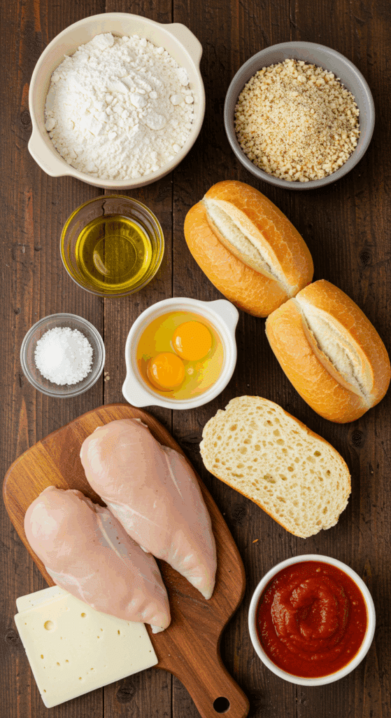 To make Chicken Parm Sandwiches for 2 servings, you’ll need these key ingredients. Each one brings a classic Italian element to the sandwich: