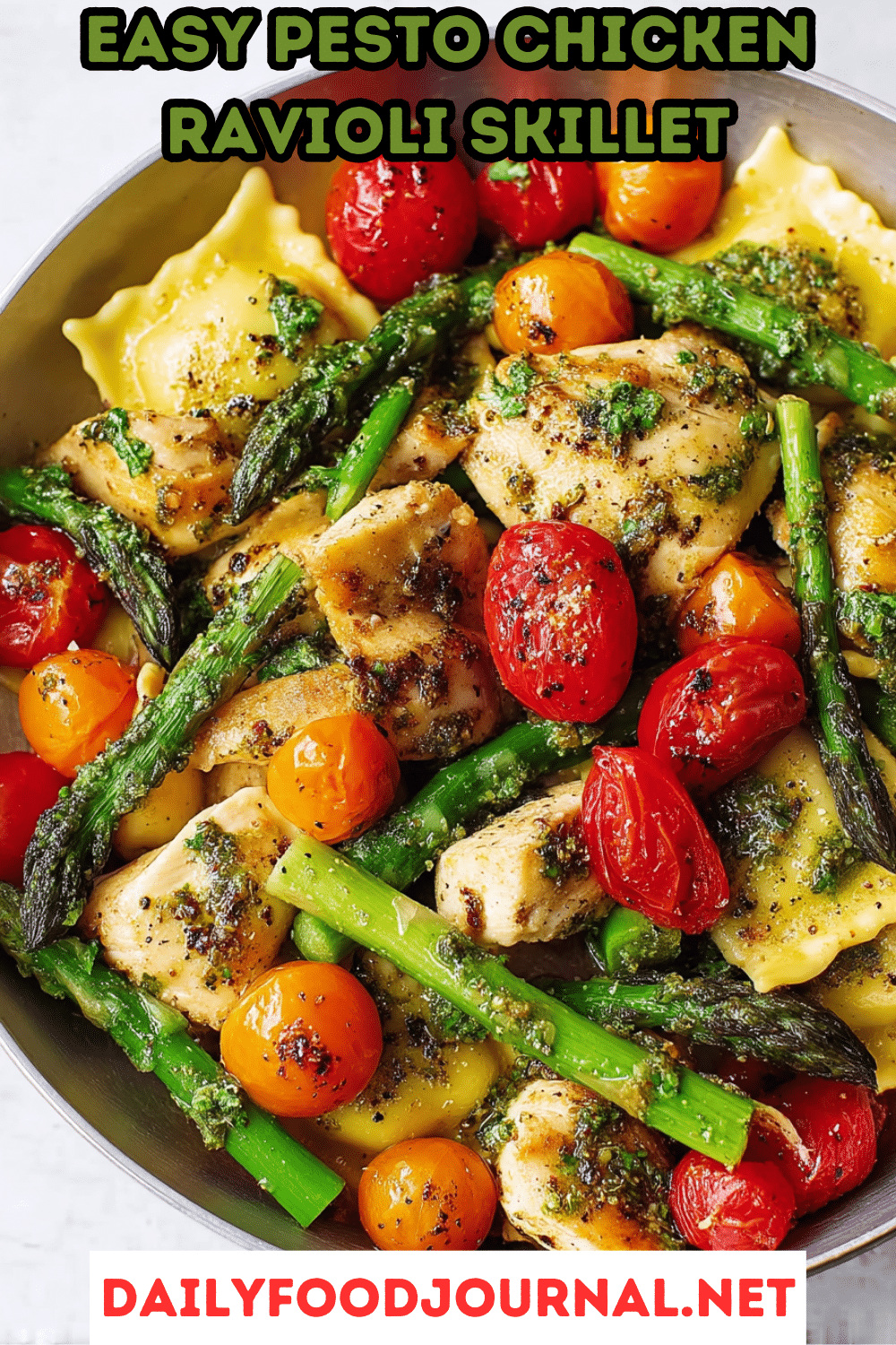 Tip: Arrange for a vibrant presentation—ravioli and chicken in the center, with colorful asparagus and cherry tomatoes scattered around. Warm plates for a cozy touch. Offer extra pesto or red pepper flakes on the side for customization.