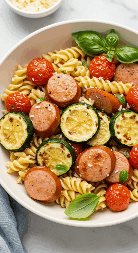 Ever wondered how to whip up a dinner that’s hearty, healthy, and bursting with flavor in under 30 minutes? Imagine juicy chicken sausages, tender zucchini, sweet tomatoes, and perfectly cooked pasta all tossed together in a light, savory sauce.