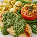Ever craved a meal that’s light, vibrant, and packed with flavor but doesn’t keep you in the kitchen all night? What if you could whip up tender chicken, zesty arugula pesto, and a colorful pasta salad in under an hour? Chicken With Arugula Pesto is your answer—a quick, healthy dish that combines juicy chicken breasts with a peppery, lemony pesto, served alongside roasted tomatoes and a fresh pasta-green bean salad