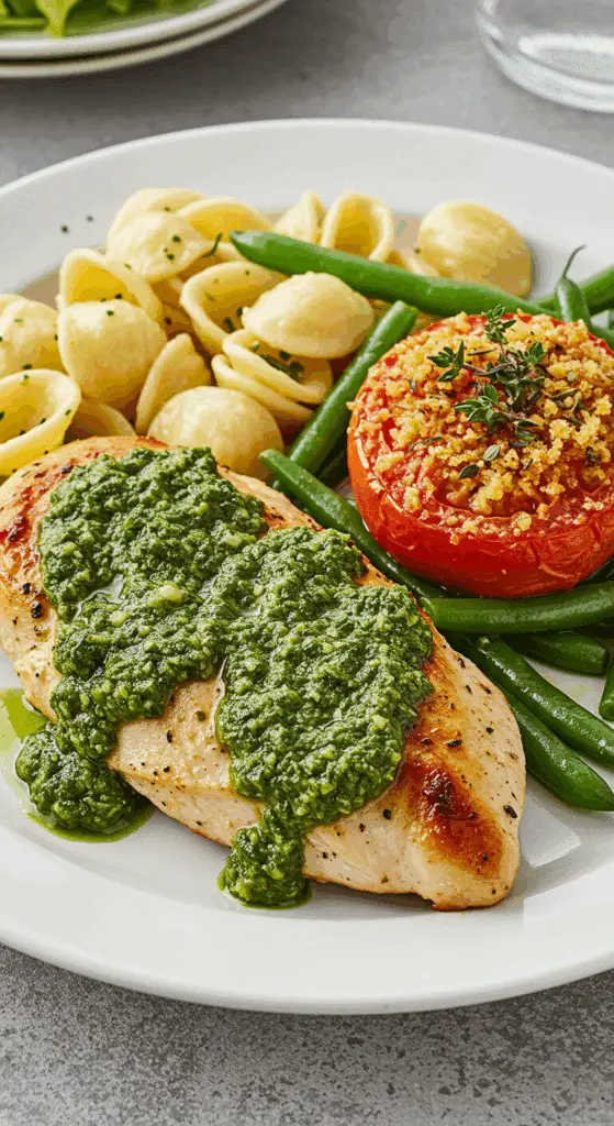 What makes Chicken With Arugula Pesto so special? It’s a bright, balanced dish that pairs tender, pesto-rubbed chicken with a peppery arugula-parsley pesto that’s both fresh and nutty. The orecchiette pasta salad with green beans adds a hearty, veggie-packed side, while broiled tomatoes bring a sweet, caramelized touch. This recipe is quick, versatile, and perfect for family dinners, date nights, or meal prep, and it’s easy enough for beginners to nail.