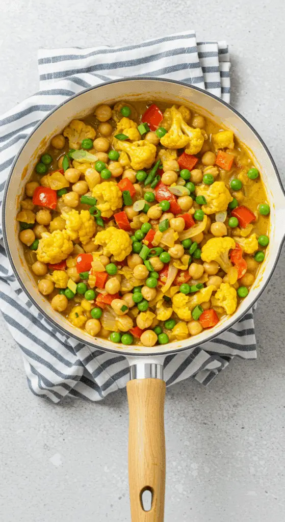 Yes! Use 2 cups frozen cauliflower florets and 1½ cups frozen peas; add directly to the curry without thawing, extending simmer time by 1–2 minutes.